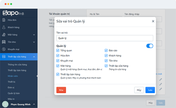 Phần mềm quản lý quán ăn, nhà hàng Sapo FnB cho phép phân quyền sử dụng cho nhân viên, mỗi nhân viên ở các vị trí khác nhau sẽ đươc giao từng công việc tương ứng và sử dụng các nghiệp vụ liên quan.